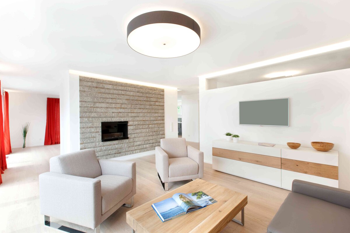 Der nach oben offene Dachraum unterstreicht das Gefühl von Weite und Offenheit. Das Familienbad mit weiterem Zugang zur Elternankleide ist streng gegliedert. Während Dusche, Badewanne und WC auf einem Podest eine Einheit bilden, ist der große Waschtisch von diesem abgetrennt. Die Ankleide erhält durch zwei Tageslichtspots genügend Licht und führt weiter ins elterliche Schlafzimmer. Die Kinderzimmer sind gleich groß gestaltet und nach Westen ausgerichtet. Sofern der Bebauungsplan es zulässt, besteht sogar die Möglichkeit, die Kinderzimmer mit Schlafemporen auszustatten. Modernste Technik und ausgewählte Materialien unterstreichen die exklusive Ausstattung des Hauses. Viele interessante Details erwarten den Besucher. Sprechen Sie ruhig einen unserer Fachberater an. Diese sind gerne bereit, Ihnen die Flexibilität des Grundrisses näher zu erläutern.